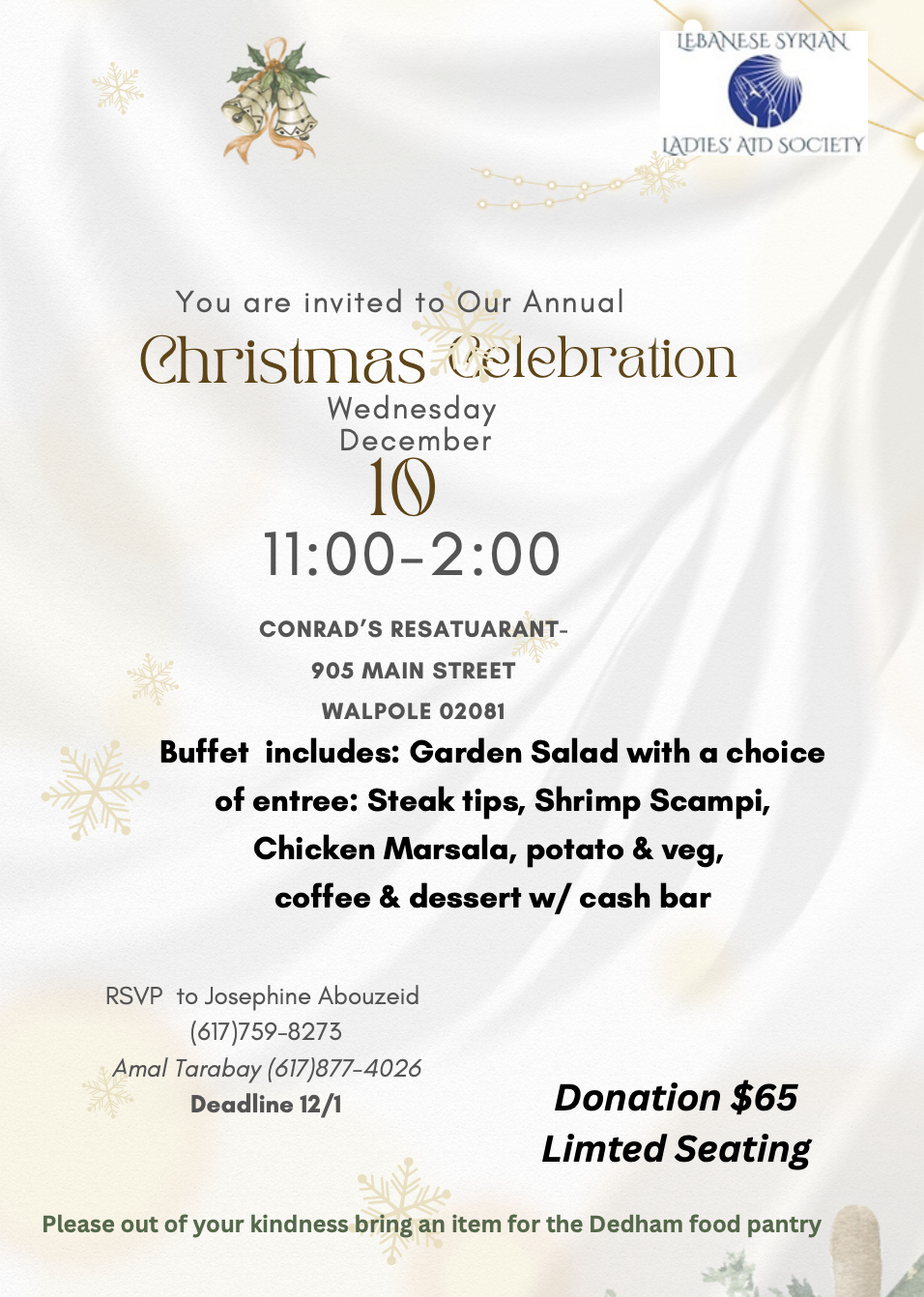 Join us for Our Annual Christmas Celebration, Wednesday, December 10th, 2025 from 11am-2pm