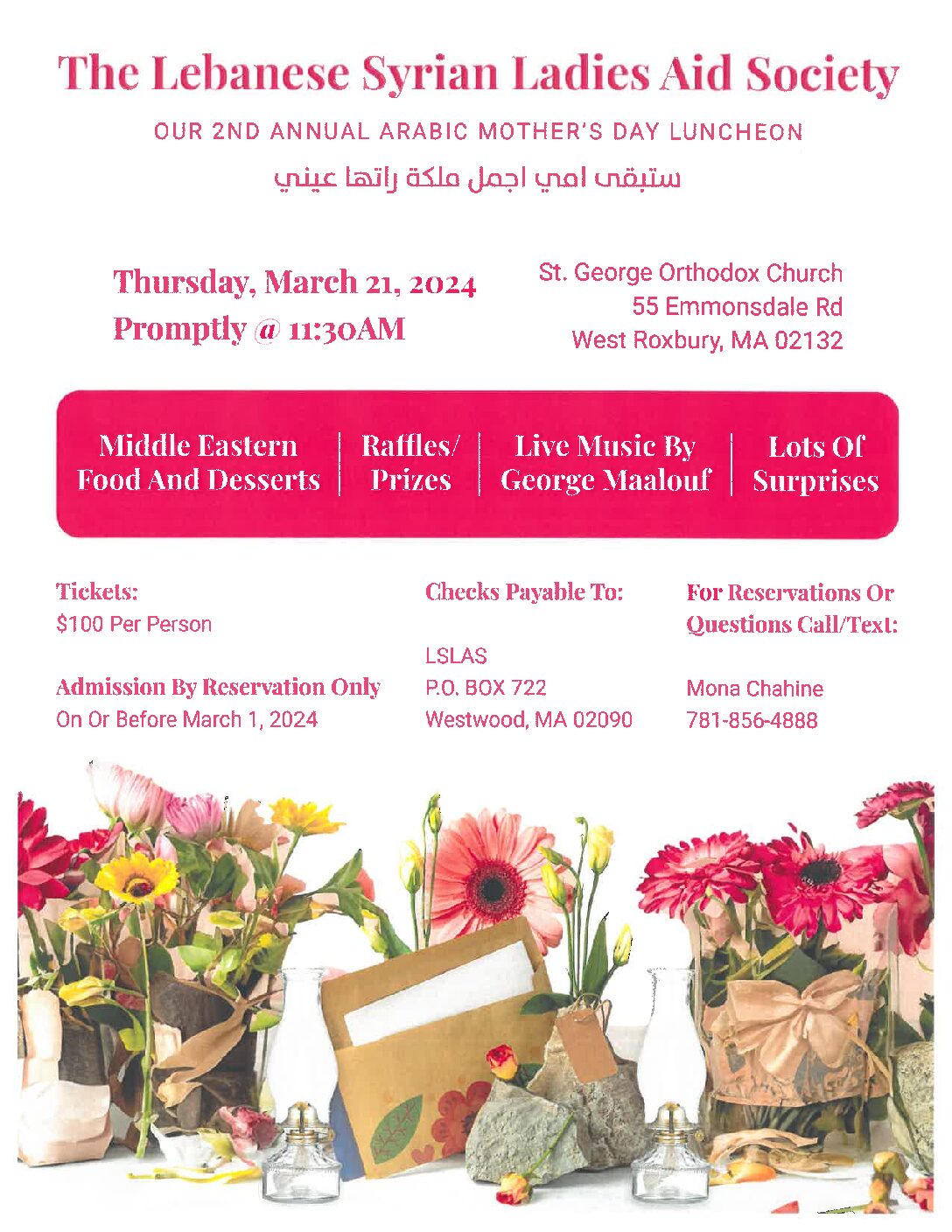 Join us for our 2nd Annual Arabic Mother’s Day Luncheon on Thursday March 21st, 2024 at St. George Orthodox Church in West Roxbury!